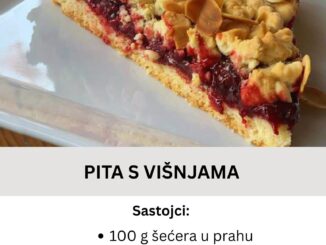 Ako volite slatko-kiselkasti okus pite s višnjama, ovaj kolač morate probati. Sastojci: ▪ 300 g brašna ▪ 1 jaje ▪ 150 g hladnog margarina/maslaca ▪ 100 g šećera u prahu ▪ pola praška za pecivo ▪ prstohvat soli ▪ žlica kiselog vrhnja […]