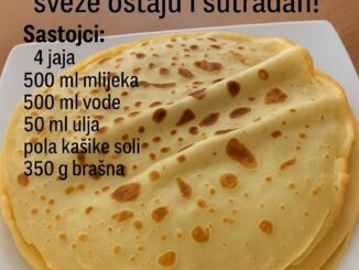 Tajna smjese za savršene palačinke: sveže ostaju i sutradan! Penaste i tanke, a najbolje od svega je što će i sutradan biti sveže Sastojci: 4 jaja 500 ml. mlijeko 500 ml. vode 50 ml. ulje […]