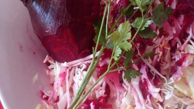 Izrendajte kupus, cveklu i šargarepu u razmeri 3:1:1. Dodajte malo začina po vašoj želji (peršun, celer), pa izmješajte povrće, ocijedite tečnost, pa prelijte salatu sokom od jednog limuna. Na kraju dodajte nekoliko kapi maslinovog ulja i vaš vitaminski obrok je gotov.