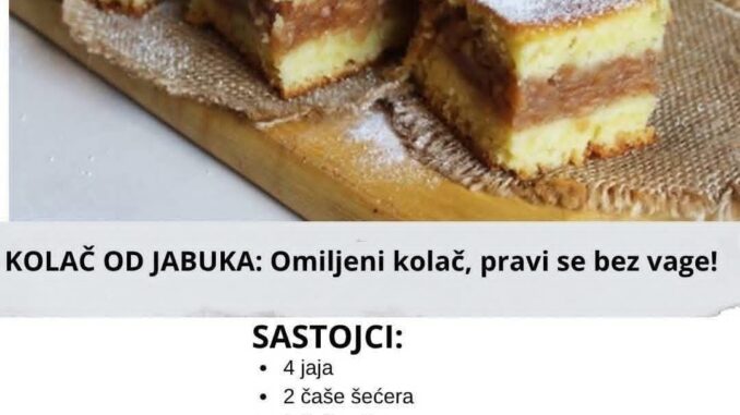 Pola biskvitne smjesu izlijte u veći kalup za pečenje (25×30 cm) kojeg ste prethodno namastili i pobrašnili. Biskvit kratko pecite cca 10 minuta na 180°C. Polupečeno tijesto ravnomjerno prekrijte nadjevom od jabuka, a zatim i ostatkom biskvitne smjese.