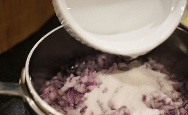 Šećer u metalnoj zdjeli umjereno zagrijavamo i miješamo dok ne porumeni, dodamo sitno isjeckani luk, kratko propržimo i dodamo vodu.