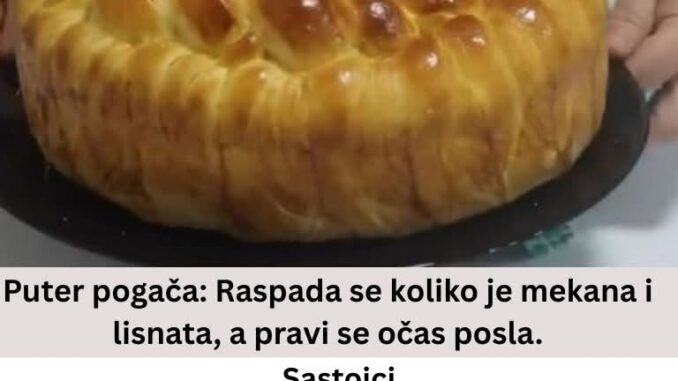 Puter pogača: Raspada se koliko je mekana i lisnata, a pravi se očas posla October 20, 2025 admin Health Comments Off on Puter pogača: Raspada se koliko je mekana i lisnata, a pravi se očas posla Sastojci: 900 g brašna100 g brašna za posipanje1 kašičica šećera30 g kvasca1 jaje1.5 kašičica soli50 ml ulja450 ml vode1 žumance za premazivanjePriprema: