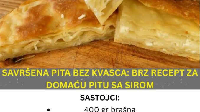 Domaća brza pita sa sirom, očas posla – bez čekanja i kvascaSa vrlo malo truda i namirnica dobićete pravu domaću pitu baš onakvu kakvu su naše bake i majke radile. Napravite I obradujte vašu porodicu I prijatelje. Jednostavna priprema a užitak neopisiv. Zašto bi išli u pekaru kada možete I sami kod kuće da napravite ovakvu pitu a verujem lepšu I od bureka.