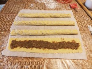 Tijesto razvaljam na pobrašnjenoj površini, rasporedim fil od jabuka i pažljivo uvijem u rolnu. Isto uradim i sa drugim dijelom tijesta.Pečenje: