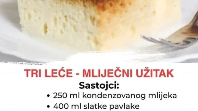 Umućenu smesu od mleka sipajte u pleh i vratite kolač unutra. Preostalih 200 ml mleka prelijte odozgo preko kolača. Za karamel preliv u šerpu stavite šećer, pa zagrevajte dok se šećer ne rastopi. U drugoj posudi zagrevajte slatku pavlaku, pa kada proključa skinite je sa vatre. Kada se šećer otopi, sklonite šerpu sa vatre i ulijte zagrejanu slatku pavlaku u tankom mlazu, sve vreme muteći žicom. Onda dodajte puter i prstohvat soli, sve dobro izmešajte, pa kada je površina kolača upila mleko prelijte preko. Ostavite na neka dva sata u frižider, a nakon toga služite.